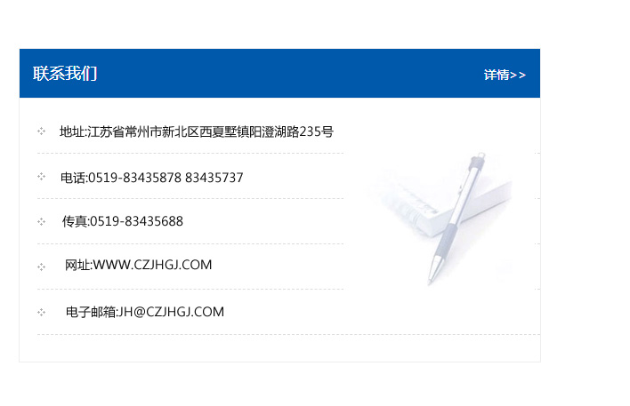 地址:常州市新北區友邦商務大廈1幢16、17層  電話:0519-85101652  傳真:0519-85112595  郵編:213022  網址:www.cz-jiayue_cn.3ppa.com  郵箱:xiajifengaa@163.com